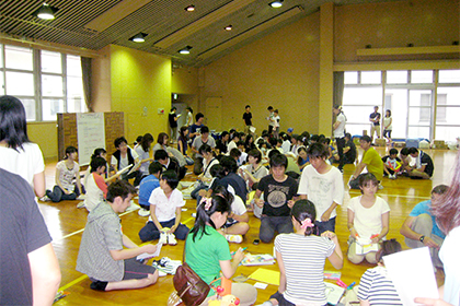 2012年8月4日(土)~5日(日)、「三重大学小児科血液腫瘍外来サマーキャンプ2012~おひさまキャンプ~」が、国立曽爾青少年自然の家(奈良県宇陀郡曽爾村)で行われました。総勢130名が参加した今年のキャンプでは、記念うちわづくりや運動会など趣向を凝らしたイベントが行われ、子どもたちは暑さも忘れて元気いっぱい2日間のキャンプを楽しみました。