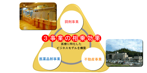 当社は、医療に特化した独自のビジネスモデルを展開しております。主力事業の調剤事業では、4兆円規模に拡大した市場を背景に、関西地区への店舗展開を進めています。医薬品卸事業では、今後市場の拡大が見込まれるジェネリック医薬品を販売しており、販路の拡大を進めています。不動産事業では、病院施設の賃貸を通じて得た医療機関経営のノウハウを活かし、メディカルモール等の開発を進めています。今後もこれら3事業の連携によるシナジー効果を活用し、良質な医療サービスの提供と収益の拡大を図って参ります。