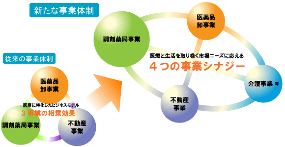 (ジェネリック医薬品卸)「医薬品卸事業」は、ジェネリック医薬品の販売強化を目的に株式会社メディシン一光として分社化。独立採算の意識を高めさらなる販売網の拡大を図ってまいります。