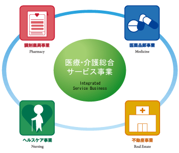 当社は調剤薬局事業、医薬品卸事業、ヘルスケア事業、不動産事業を推進しています。