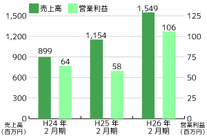 当期におきましては、2013年7月に介護付有料老人ホーム「ハーモニーハウス伊賀上野」(三重県)を新規開設いたしました。施設総数が9施設となるとともに、入居者数も順調に増加したことにより、売上高1,549百万円(前年同期比34.2%増)、営業利益106百万円(同80.0%増)となりました。