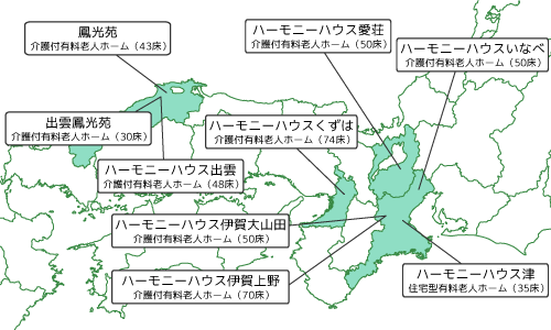 三重県・滋賀県・大阪府・島根県にて特定施設(介護付有料老人ホーム)、住宅型有料老人ホームを運営するとともに、兵庫県では訪問介護及び居宅介護支援の事業所を展開しております。超高齢社会の進展に伴い介護分野の需要がますます高まる中、多様な介護サービスを提供できる体制の充実を図っております。