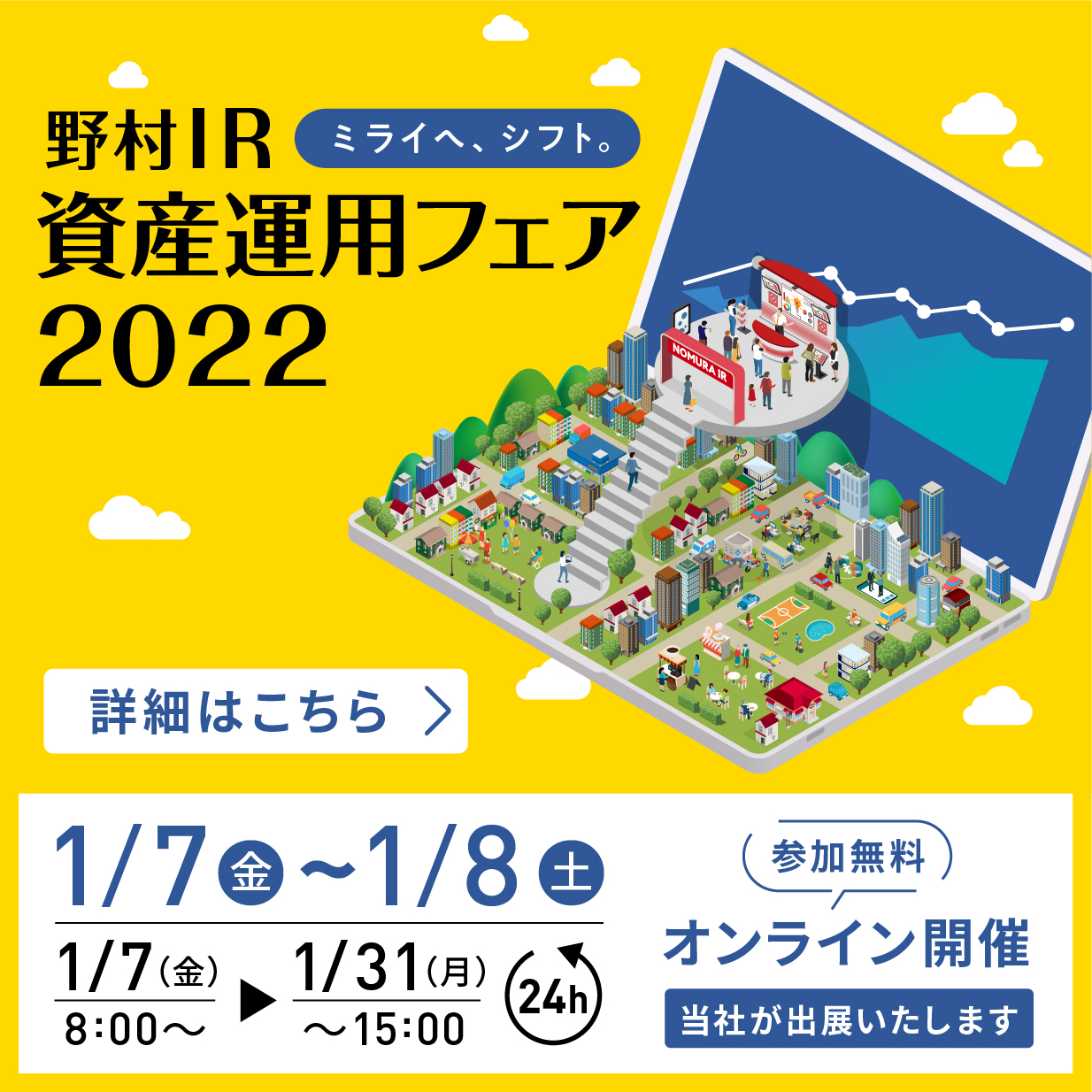 当社は、2022年1月7日(金)、8日(土)(Webサイトオープン期間は2022年1月31日(月)迄)にオンラインで開催される個人投資家様向けイベント「野村IR資産運用フェア2022」に出展しますので、お知らせします。