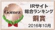ゴメス・コンサルティング株式会社が行った「Gomez IRサイトランキング2016」において、当社サイトが銅賞を受賞しました。また、新興市場総合ランキング6位の評価を受けました。