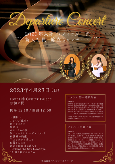 当社グループは、4月23日にHotel津Center Palaceにおいて、ソプラノ歌手 野々村彩乃さんとピアニスト 田中雅子さんによる「メディカル一光新入社員 旅立ちコンサート」を開催しました。