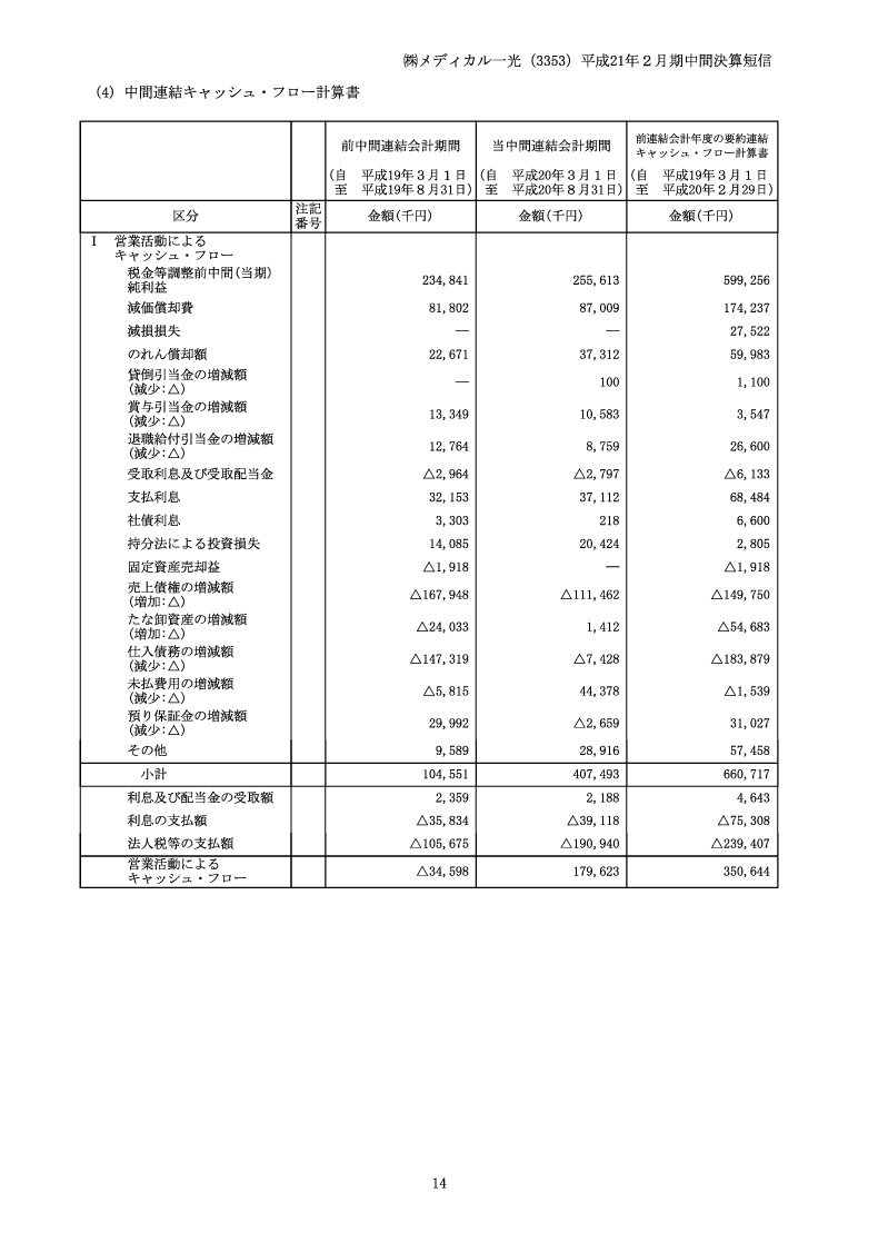 平成21年2月期 中間決算短信 中間連結キャッシュ・フロー計算書