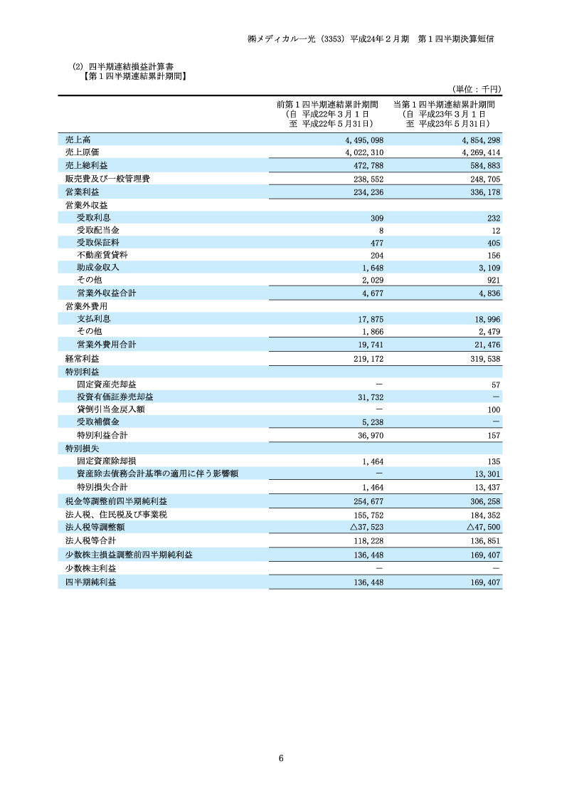 平成24年2月期 第1四半期決算短信 損益計算書