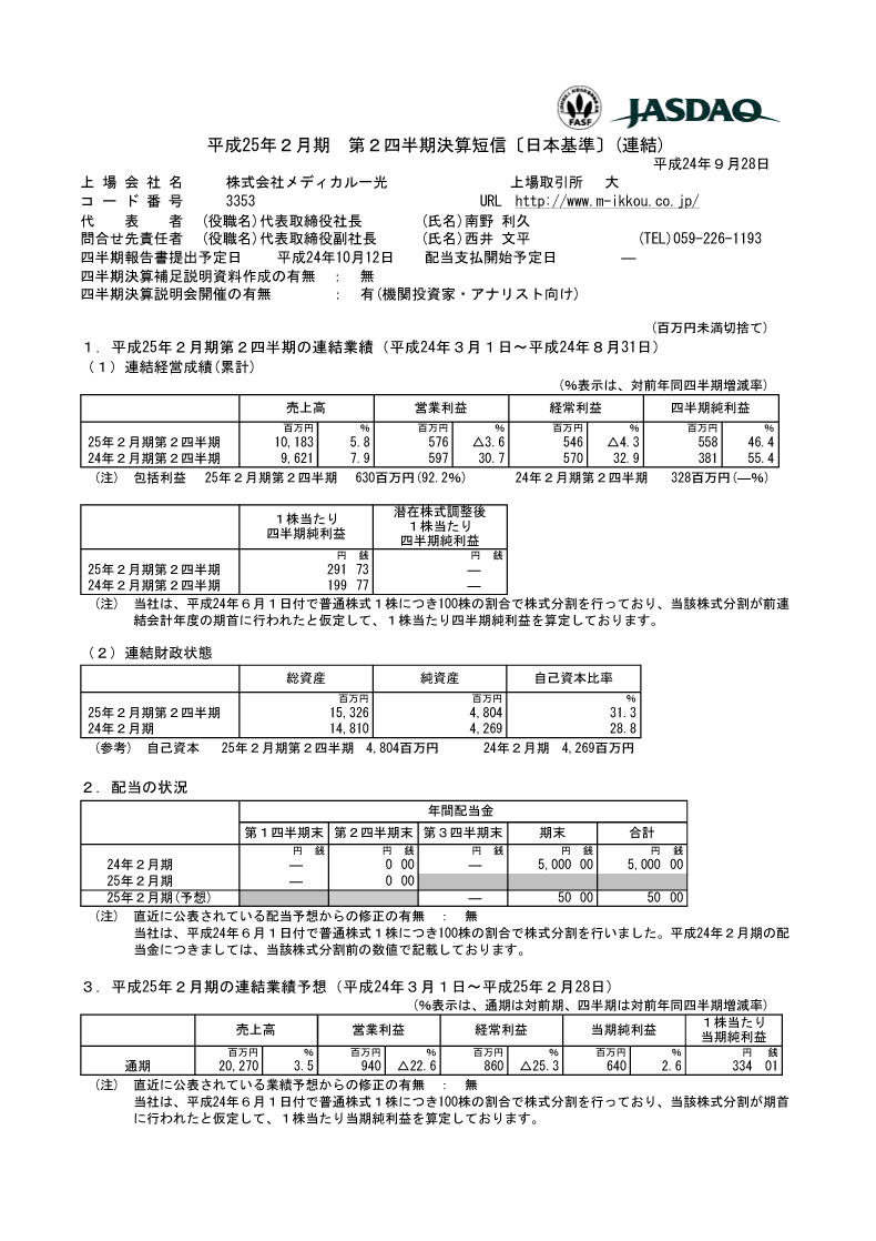 平成25年2月期 第2四半期決算短信 決算短信