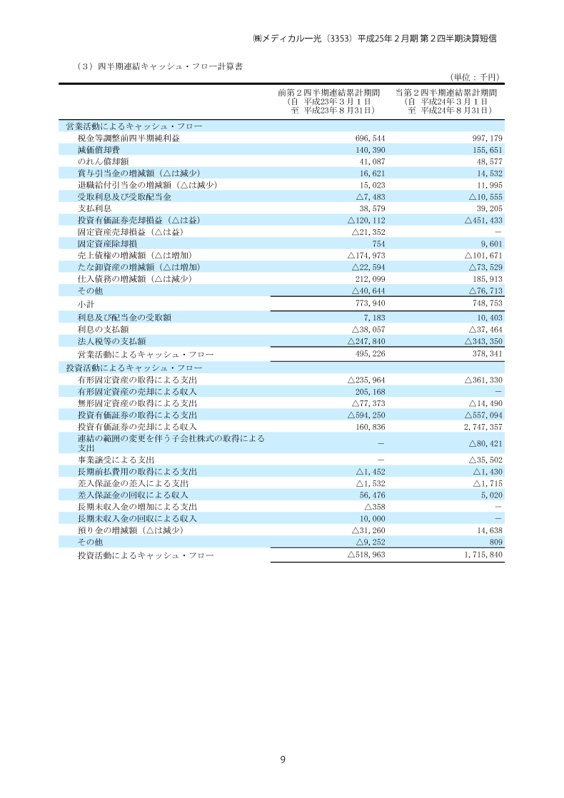 平成25年2月期 第2四半期決算短信 キャッシュ・フロー計算書