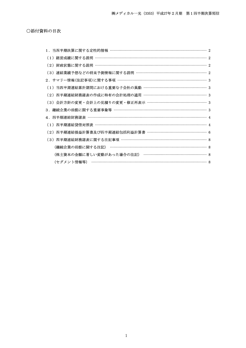 平成27年2月期 第1四半期決算短信 添付資料の目次