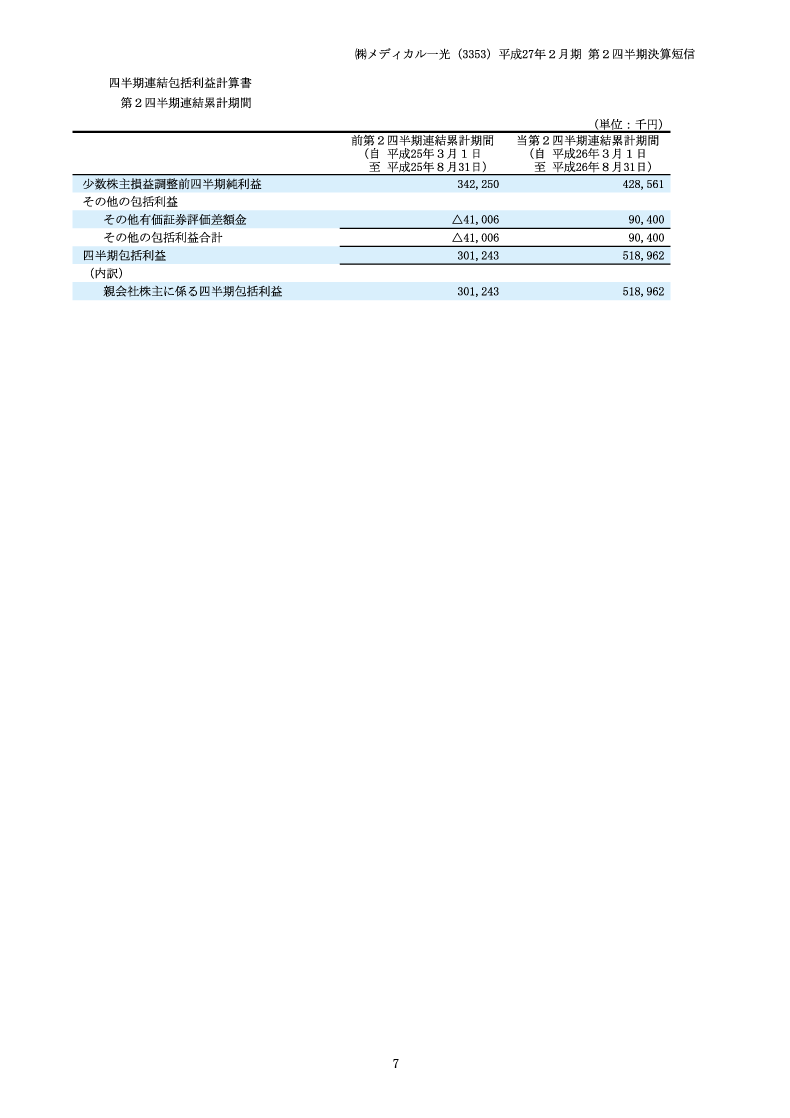 平成27年2月期 第2四半期決算短信 包括利益計算書