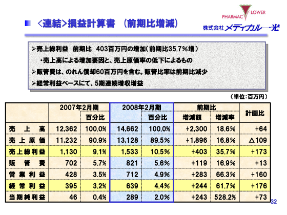2008年2月期 決算説明会 <連結>損益計算書(前期比増減)