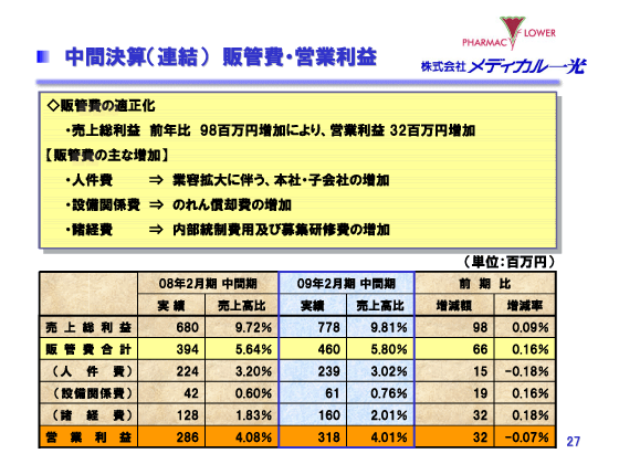 2009年2月期 中間決算説明会 中間決算(連結) 販管費・営業利益