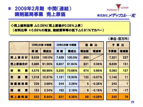 2009年2月期 中間決算説明会 2009年2月期 中間(連結) 調剤薬局事業 売上原価