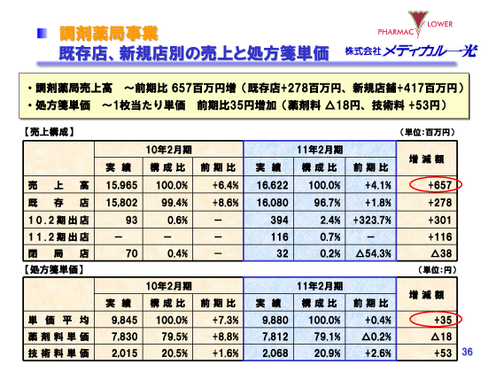 2011年2月期 決算説明会 既存店、新規店別の売上と処方箋単価(調剤薬局事業)