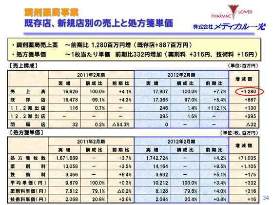 2012年2月期 決算説明会 調剤薬局事業 既存店、新規店別の売上と処方箋単価
