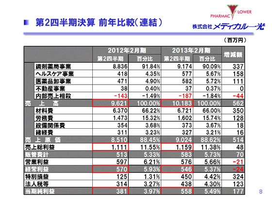 2013年2月期 第2四半期決算説明会 第2四半期決算 前年比較(連結)