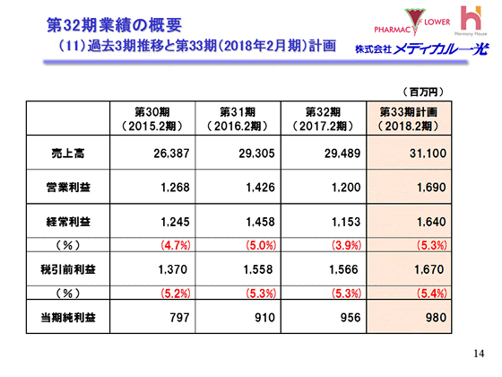 2017年2月期 決算説明会 (11)過去3期推移と第33期(2018年2月期)計画