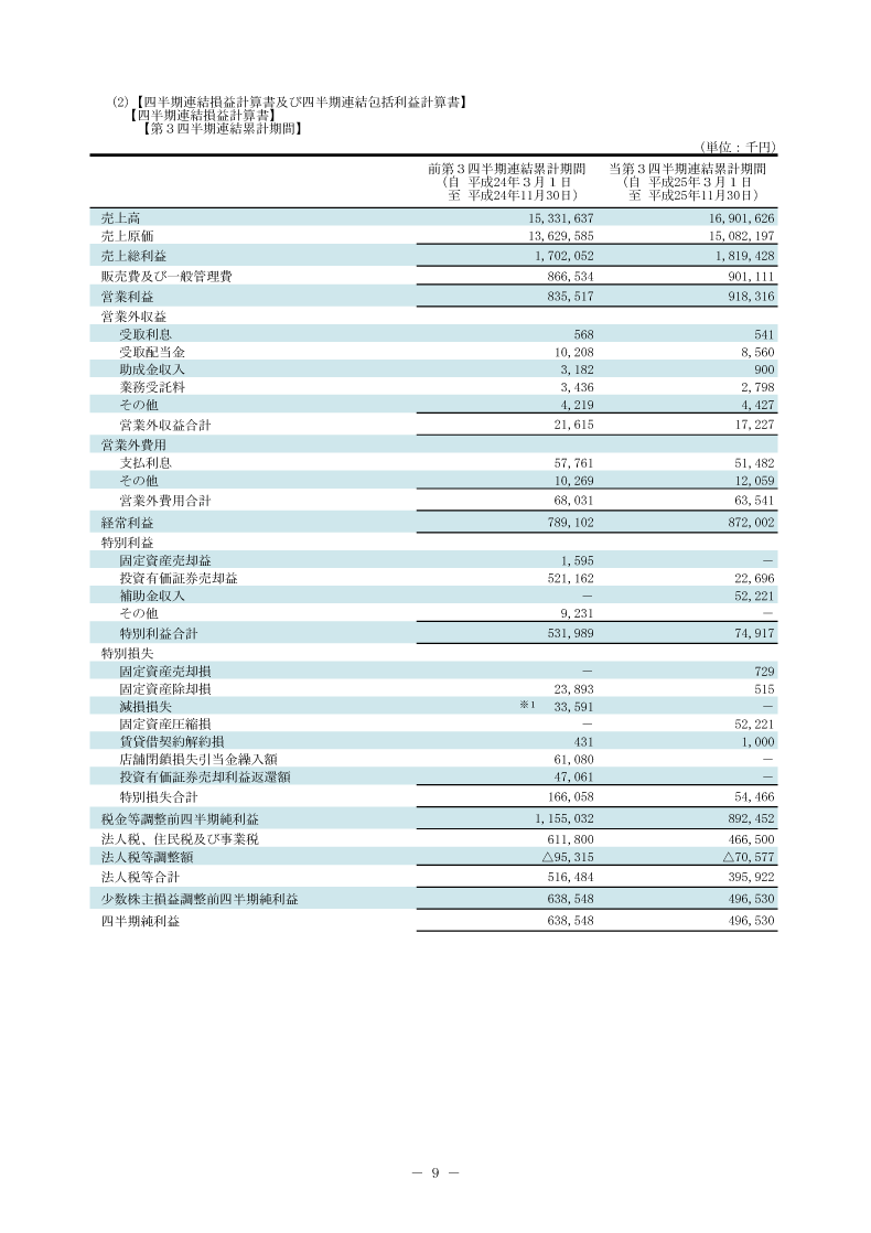 平成26年2月期 第3四半期報告書 四半期連結損益計算書