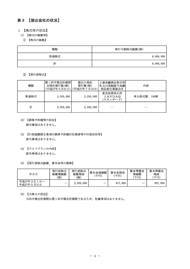 平成28年2月期 第1四半期報告書 [第3]提出会社の状況