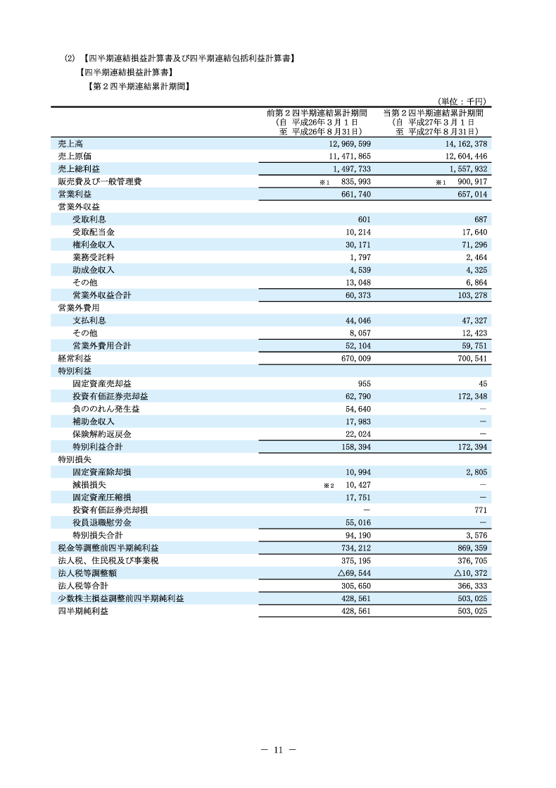 平成28年2月期 第2四半期四半期報告書 四半期連結損益計算書