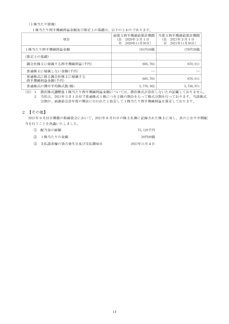 2022年2月期 第3四半期四半期報告書